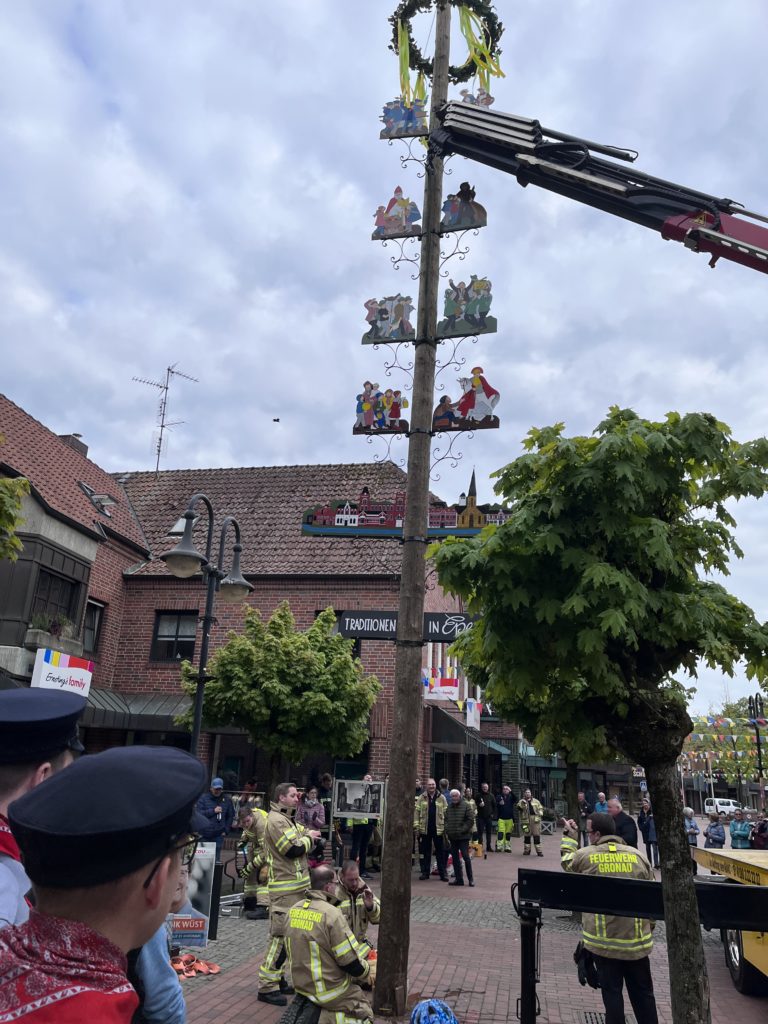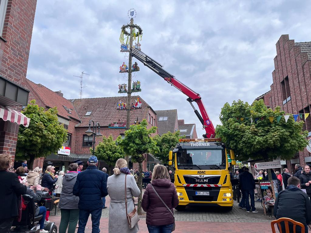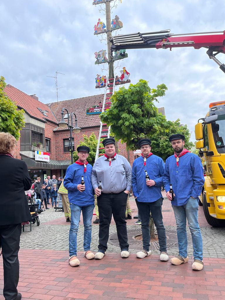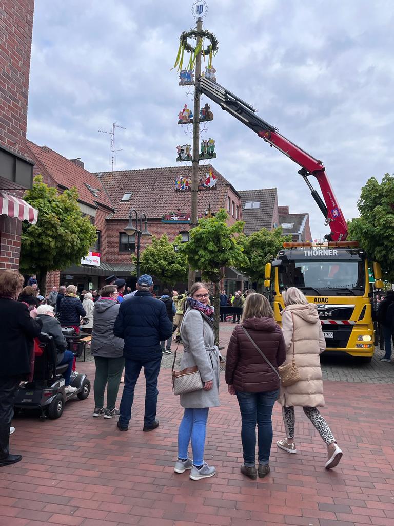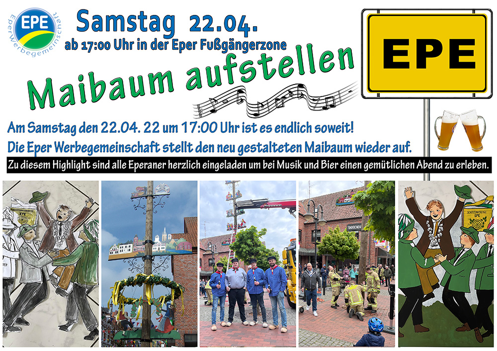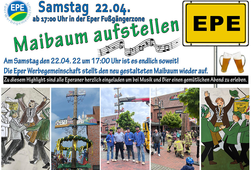 Wir wollen den Maibaum gemeinsam mit Euch in einem passenden Rahmen aufstellen. Der 13,5 Meter lange, wuchtige Fichtenstamm wird von der Freiwilligen Feuerwehr Epe und dem Kranwagen des Autohauses Thörner am Samstag, 22.04.2023 um 17:00 Uhr in der Fußgängerzone aufgestellt. Anschließend ist Zeit für ein gemütliches Beisammensein mit Musik und viel Zeit zum Klönen.